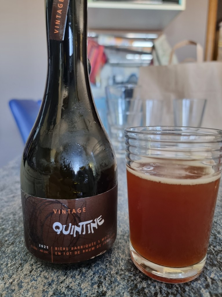 Couleur brunâtre. Les odeurs nasales suggèrent cette maturation en fûts de chêne ayant contenu du rhum. Cela sonne exotique. Dommage que ce sentiment ne perdure pas en bouche. Parce que finalement on est sur une Quintine dont l’amertume est renforcée. Pas de complexité particulière due au vieillissement en fûts, ce qui est vraiment dommageable.